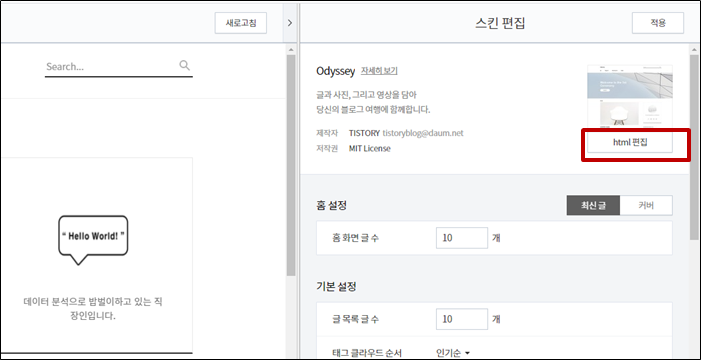 - 본인 Tistory 주소 /manage 사이트 > 꾸미기 > 스킨편집