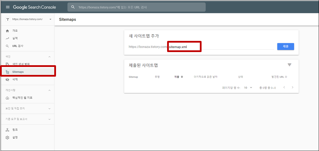 - 본인 블로그의 sitemap 주소 확인: 블로그 > 관리 > 블로그 > 주소설정에 보면 확인 가능