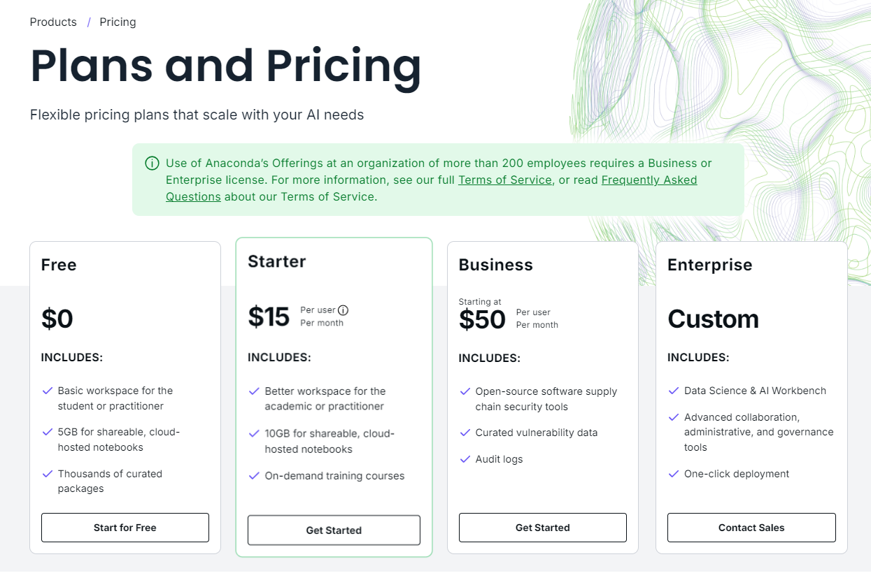 따라서, 200명 이상의 기업에서 근무하는 개발자라면 Anaconda 웹사이트에서 Pro 이상의 라이선스를 구매해야 합니다.
