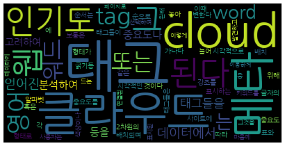 text = '태그 클라우드(영어: tag cloud) 또는 워드 클라우드(word cloud)는 메타 데이터에서 얻어진 태그들을 분석하여 중요도나 인기도 등을 고려하여 시각적으로 늘어 놓아 웹 사이트에 표시하는 것이다. 보통은 2차원의 표와 같은 형태로 태그들이 배치되며 이때 순서는 알파벳/가나다 순으로 배치 된다. 시각적인 중요도를 강조를 위해 각 태그들은 그 중요도(혹은 인기도)에 따라 글자의 색상이나 굵기등 형태가 변한다. 사용자는 이렇게 표시된 태그 중 마음에 드는 키워드를 발견하고 그것을 선택하여 그 메타 데이터에 원래 연결된 웹 페이지로 이동하게 된다.'