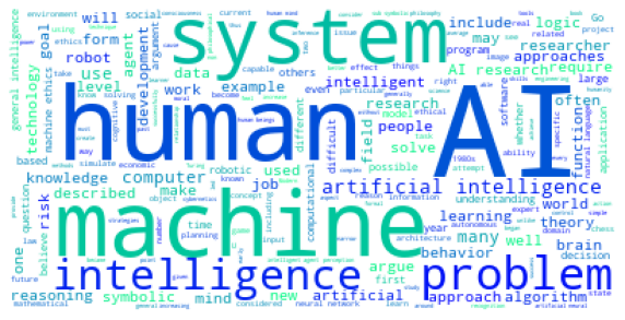 wordcloud = WordCloud(background_color='white', colormap='winter').generate(text)