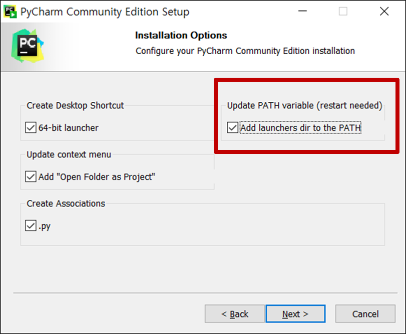 Update Path variable 체크: 명령 프롬프트(cmd)에서 Pycharm에 직접 접근 가능 → 모듈 설치시 용이