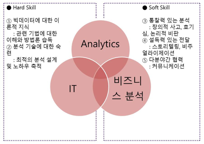 - Hard skill: 빅데이터의 처리 및 분석에 필요한 이론적 지식과 기술적 숙련에 관련된 능력
