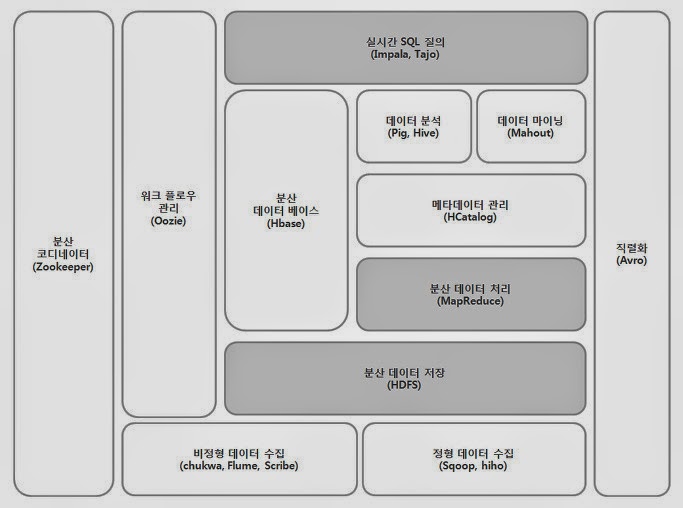 - 실시간 SQL 질의 - SQL on 하둡: 아파치 드릴, 아파치 스팅거, 아파치 타조, 임팔라 등