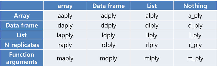 - plyr 패키지: apply함수에 기반한 입력과 출력데이터를 동시에 배열로 치환하여 처리하는 패키지