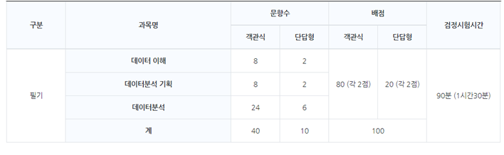 데이터분석 준전문가 자격시험은 실기시험은 없으며 필기시험은 PBT(Paper Based Test) 방식으로 자격을 검정하며, 필기시험 합격기준 요건을 충족하면 최종합격자로 분류되어 데이터 분석 준전문가 자격이 부여된다.