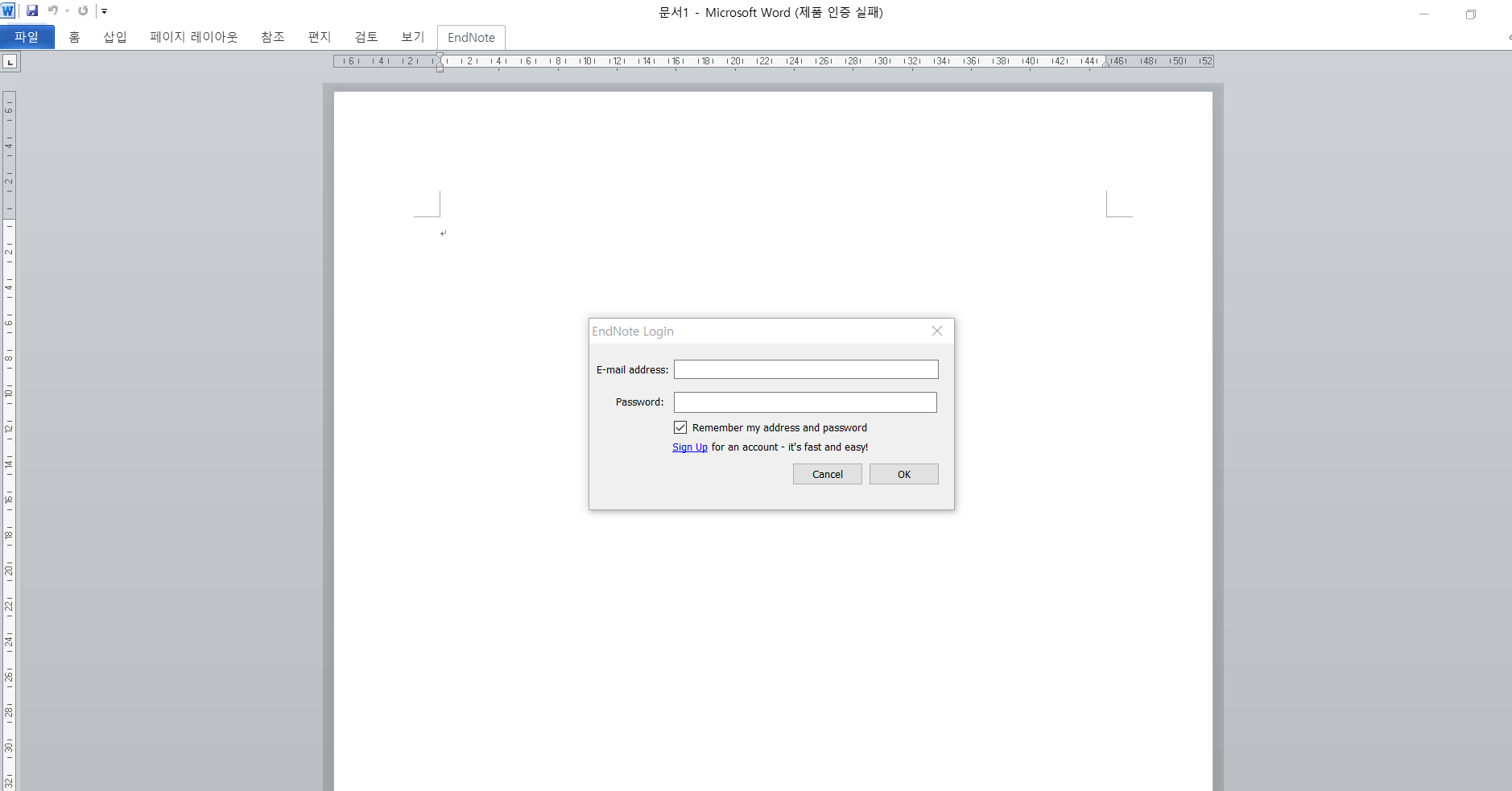 상단에 Endnote가 플러그인 되고, 로그인을 통해 웹으로 서지를 관리할 수 있다.